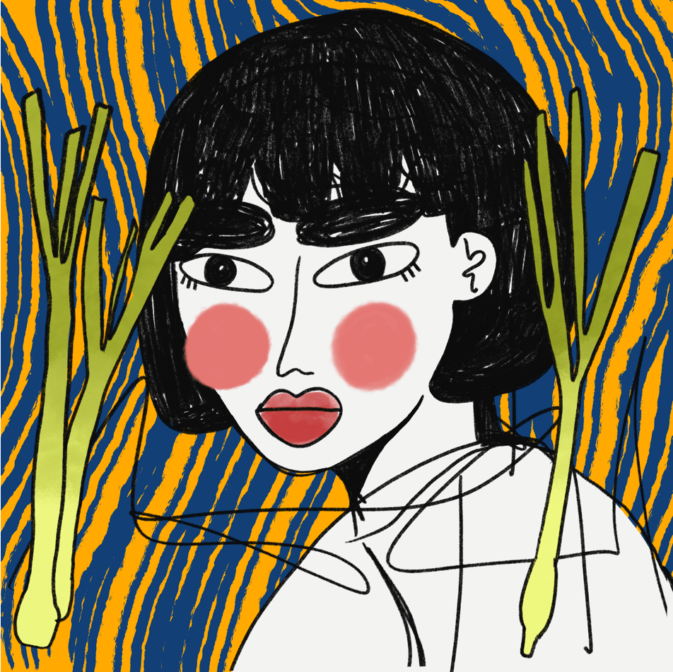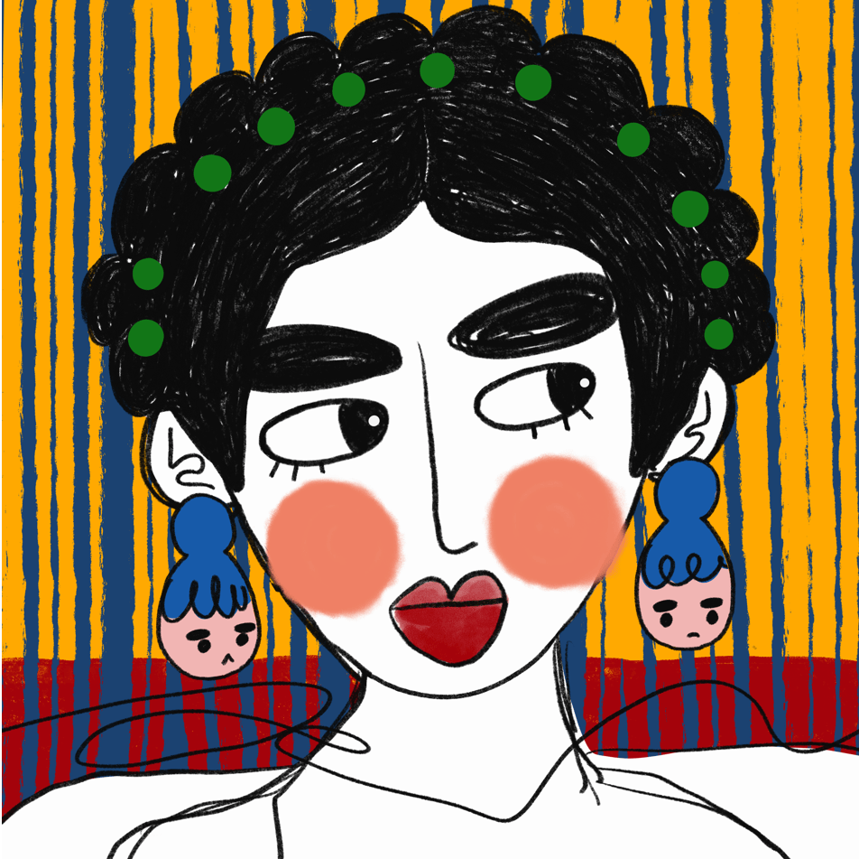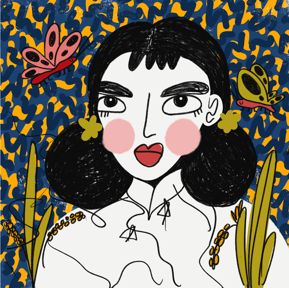A series done in a style of muted skin tone, loose scribbles, and patterned backgrounds.